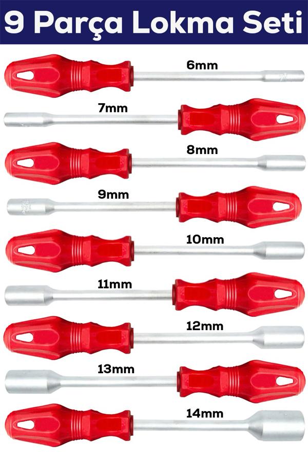 Geniş kullanım yelpazesi sunan 9 parça lokma tornavida seti, farklı boyutlardaki vidaları kolayca sıkmak ve gevşetmek için idealdir; 6, 7, 8, 9, 10, 11, 12, 13 ve 14 mm boyutlarındaki lokma uçları sayesinde çeşitli vidalama işlemleri için mükemmel uyum sağlar; Tornavida seti, evde, atölyede veya iş yerinde çeşitli onarım ve montaj işleri için vazgeçilmez bir araçtır; Dayanıklı ve uzun ömürlü malzemeden üretilmiş olup, sık kullanıma uygun tasarlanmıştır; Kullanışlı ve kompakt tasarımı sayesinde taşıması kolaydır; her zaman yanınızda bulundurabileceğiniz pratik bir alettir;